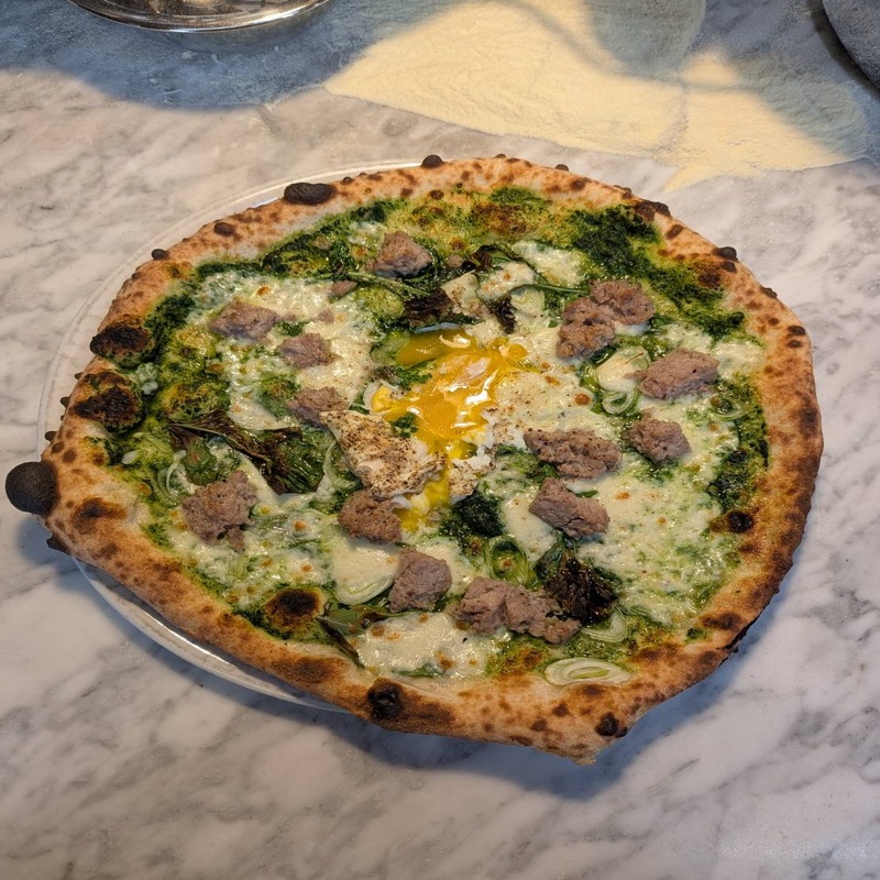 自家製サルシッチャ、ほうれん草ペースト、冬野菜、燻製チーズ、タマゴ、黒胡椒 12月〜2月の冬限定ピッツァ 数種類のスパイスと粗挽き国産豚肉で作ったジューシーなソーセージが特徴 今回は、地元の伊予さんぽーくをサルシッチャに使用しました(o^^o) テイクアウトメニューはこちらから